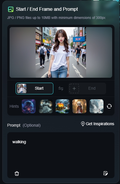 하여간 방금 만든 이미지를 넣고 프롬프트를 넣어 줍시다. 걷는 동작이 좋겠네요.