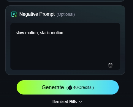 10초가 짧은 시간이기 때문에 느릿느릿 움직이다가 시간이 다 가면 아깝겠죠? 네거티브 프롬프트에 슬로우 모션 및 스태틱 모션을 넣어줍니다.